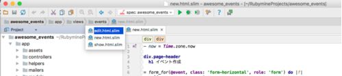 ナビゲーションバーの表示 空白文字の表示 ツールバーの表示 環境 ナビゲーションバーの表示 現在開いているファイルの階層をウィンドウ上部に表示させます。 View > Nabigation Bar を選択 画面上部に awesome_events > app >views > events > new.html.sli…